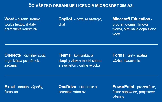 - desktopové aplikácie WORD, EXCEL, POWER POINT, OUTLOOK, ONENOTE, PUBLISHER, ACCESS (vieš si ich nainštalovať až do 5 - tich zariadení)